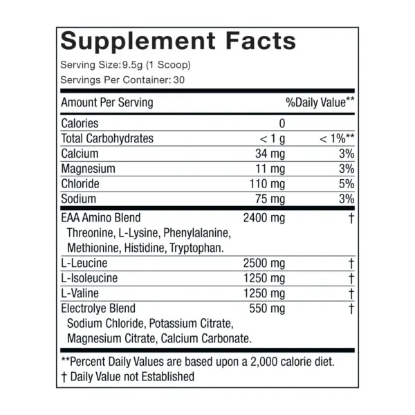 Complete Amino Acid Blend: Includes BCAAs (Leucine, Isoleucine, and Valine) plus all nine essential amino acids.